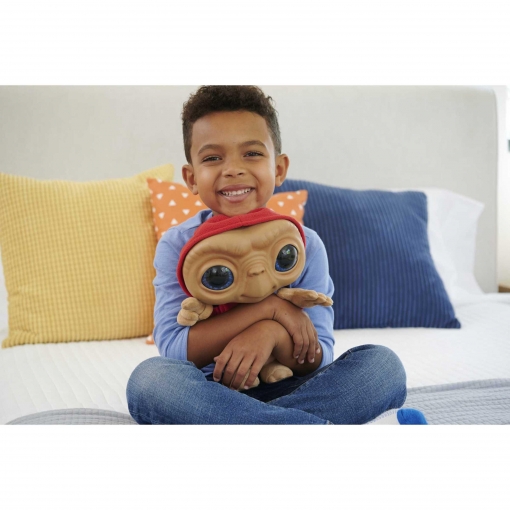 Celebra 40 años de aventuras más allá de la luna con E.T. Este muñeco de peluche coleccionable de E.T. es el regalo perfecto para los fans del extraterrestre de cualquier edad. El entrañable icono de los 80 vuelve para celebrar su 40 aniversario en forma de adorable muñeco, con un cuerpo suave, una cabeza de plástico llena de detalles y ojos de cristal con un diseño realista. E.T. Teléfono. Mi casa. Presiona el dedo del muñeco para ver cómo se ilumina la punta y escucha los sonidos y frases más icónicas de la película. Este suave peluche de E.T. va vestido como su mejor amigo Elliot: con una sudadera roja con cremallera y capucha a medida.