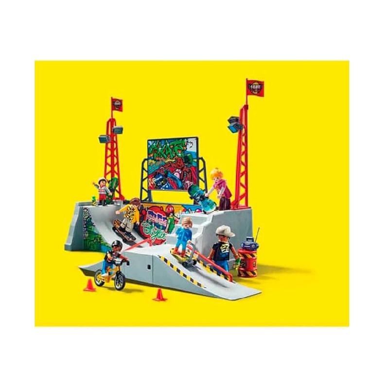Skatepark con rampas, figuras de skaters y accesorios para recrear trucos y competiciones. Perfecto para los amantes del skate.