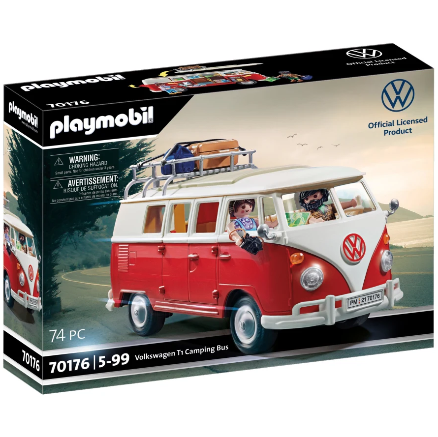 Un icono en la carretera: la Volkswagen T1 Camping Bus. Amada por generaciones, son incontables los aventureros que han viajado por el mundo en este camping bus. Por supuesto, también la versión PLAYMOBIL cuenta con muchos de sus detalles característicos, como el frontal iconográfico en forma de V con separación de colores rojo y blanco y el logotipo rojo de VW, el techo redondeado, el parabrisas dividido y la baca del techo desmontable. Al abrir la sección del techo, se descubre el interior con una mesa plegable con dos asientos y un lavabo con nevera. Los asientos tienen el típico diseño de cuadros de los años 60,y las puertas laterales también pueden abrirse. Una puerta incluye un estante para la comida y la otra un estante con bisagras y un espejo. El set incluye además dos clicks de PLAYMOBIL, maletas y muchos otros extras accesorios.