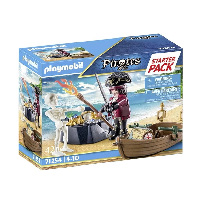 ¡Embárcate en emocionantes aventuras piratas con este set de inicio! Incluye una figura de pirata, un bote con remos y un cofre del tesoro.