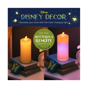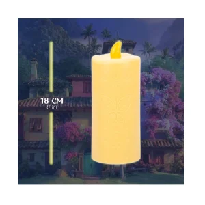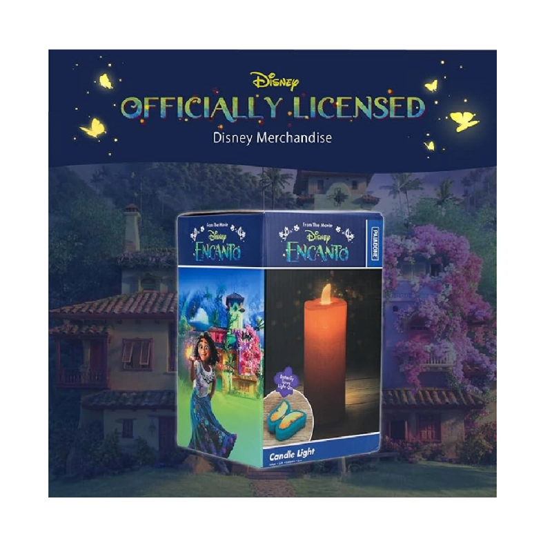 Esta vela electrónica de “Encanto” viene con un control remoto en forma de mariposa y cambia de color. Funciona con 2 baterías AA y mide aproximadamente 7 cm x 7 cm x 18 cm[7][8].